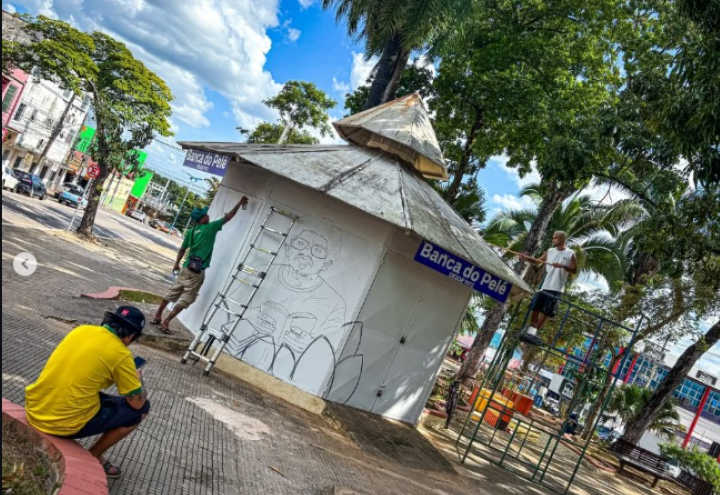 Quem passa pela Praça Povos da Floresta nos últimos dias percebe que tem tinta fresca contando história ali. A tradicional Banca do Pelé, ponto conhecido do Centro de Rio Branco, começou a ganhar novas cores com uma intervenção de graffiti feita por artistas da cidade, como parte da recuperação do espaço.