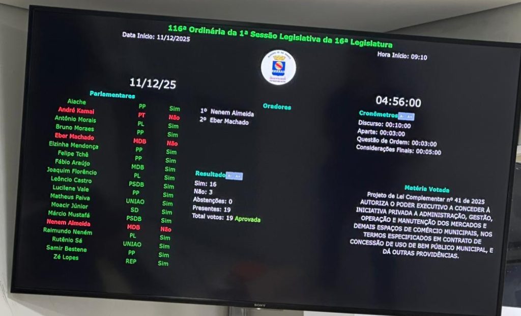 Além da privatização dos mercados, os vereadores aprovaram um conjunto de matérias do Executivo e do Legislativo. O destaque foi a Lei Orçamentária Anual de 2026, que fixa receita e despesa em R$ 2,42 bilhões, montante 2,42% inferior ao orçamento de 2025.