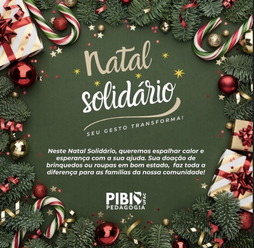 O Programa Institucional de Bolsa de Iniciação à Docência (Pibid), vinculado ao curso de Pedagogia da Universidade Federal do Acre (Ufac), lançou a quinta edição do Projeto Natal Solidário com o objetivo de mobilizar a comunidade na arrecadação de brinquedos e roupas destinadas a pessoas em situação de vulnerabilidade social.