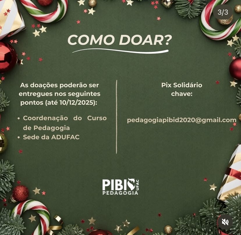 As doações podem ser entregues até o dia 10 de dezembro de 2025 na Coordenação do Curso de Pedagogia da Ufac e na sede da Adufac. Também é possível colaborar via Pix, pela chave pedagogiapibid2020@gmail.com, ou por meio da Rifa Solidária, divulgada no perfil do projeto no Instagram.