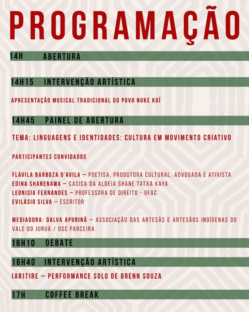 A programação está organizada em dois eixos principais. O primeiro painel, “Linguagens e Identidades: Cultura em Movimento Criativo”, reúne a liderança indígena Edina Carlos Brandão, do povo Shanenawa, a poeta Flávila D’Ávila, a professora e escritora Leonísia Fernandes, da Universidade Federal do Acre, e o poeta Evilásio Silva. A proposta é discutir como as expressões artísticas dialogam com o território e contribuem para a afirmação cultural.