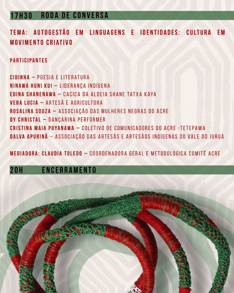 Na sequência, a roda de conversa “Autogestão: Cultura em Movimento Criativo” aposta em um formato horizontal, sem hierarquia de saberes. Participam do diálogo Dalvanir Justino de Araújo, conhecida como Dalva Apurinã, presidente da associação de artesãos indígenas do Vale do Juruá, Cristina de Araújo Maia, do povo Puyanawa, a representante da Associação das Mulheres Negras do Acre, Rosalina Souza, a agricultora e artesã Vera Lúcia Braz, a liderança indígena Ninawa Huni Kuĩ, a dançarina performer Dy Christal e a representante da literatura regional, Cidinha.