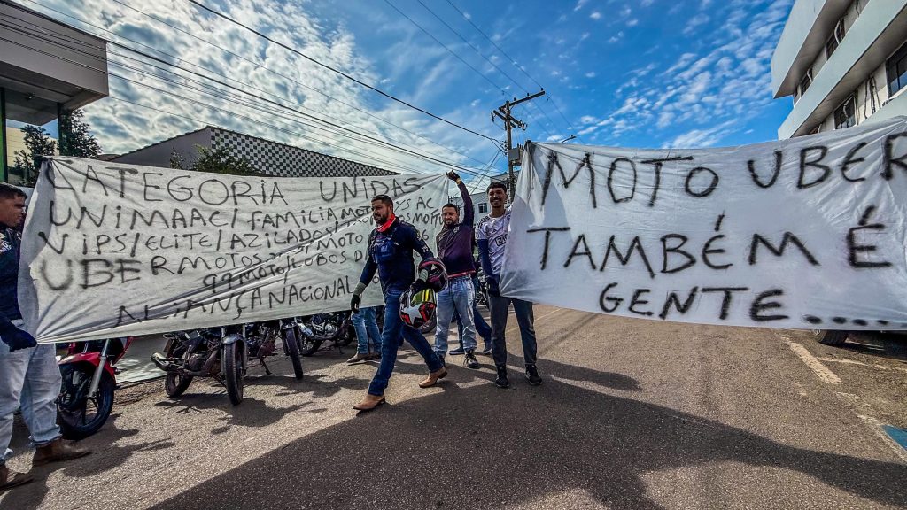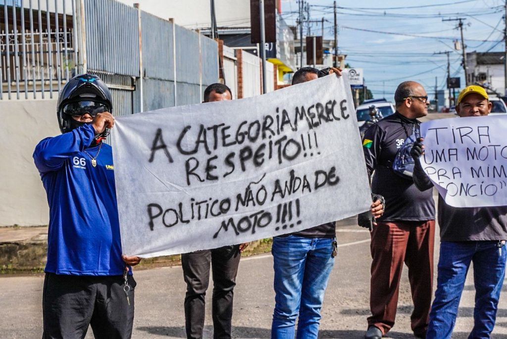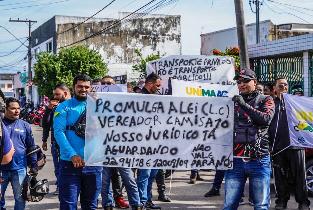 Motociclistas que atuam em aplicativos de transporte realizaram, na manhã desta terça-feira (17), uma manifestação em frente à Câmara Municipal de Rio Branco, capital do Acre. O ato foi convocado por representantes da categoria após a aprovação de um projeto de lei que pretende regulamentar o transporte de passageiros por motocicletas no município.