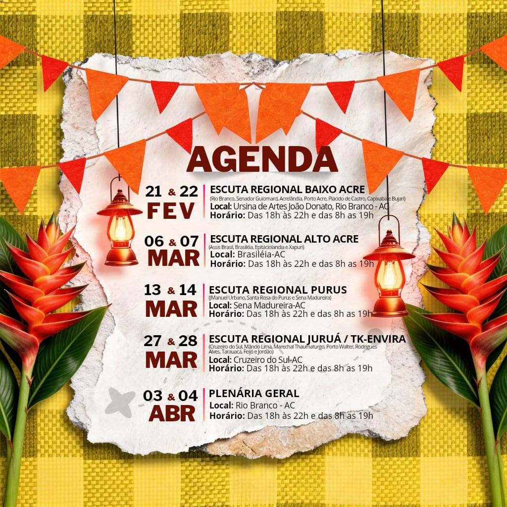 A primeira Escuta Regional do Baixo Acre acontecerá nos dias 21 e 22 de fevereiro, na Usina de Artes João Donato, em Rio Branco, das 18h às 22h e das 8h às 19h. A programação incluirá credenciamento, abertura institucional, apresentação do projeto, leitura e aprovação do regimento interno das escutas, além de palestras e oficinas voltadas à organização e metodologia junina.