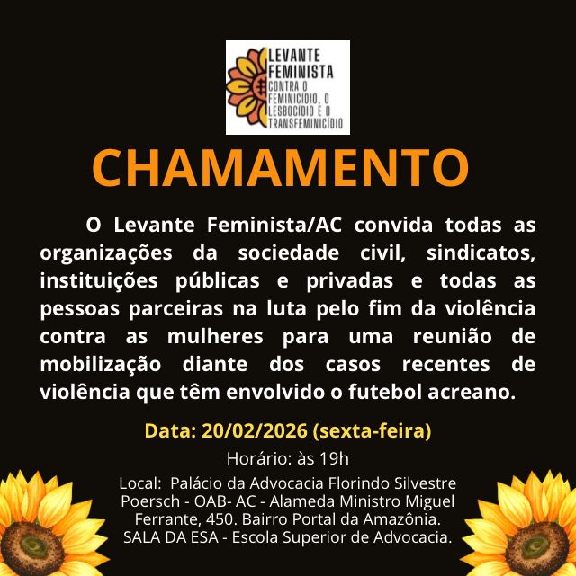 Organizações feministas e movimentos sociais convocaram uma reunião aberta nesta sexta-feira (20), em Rio Branco, para discutir estratégias de enfrentamento à violência contra mulheres após episódios recentes envolvendo o futebol acreano.