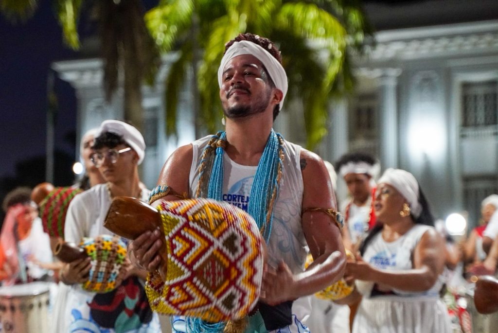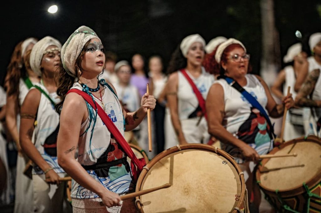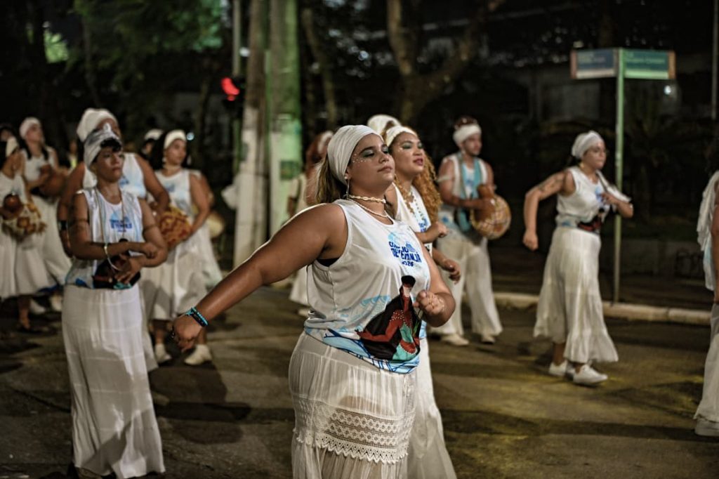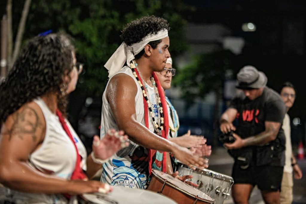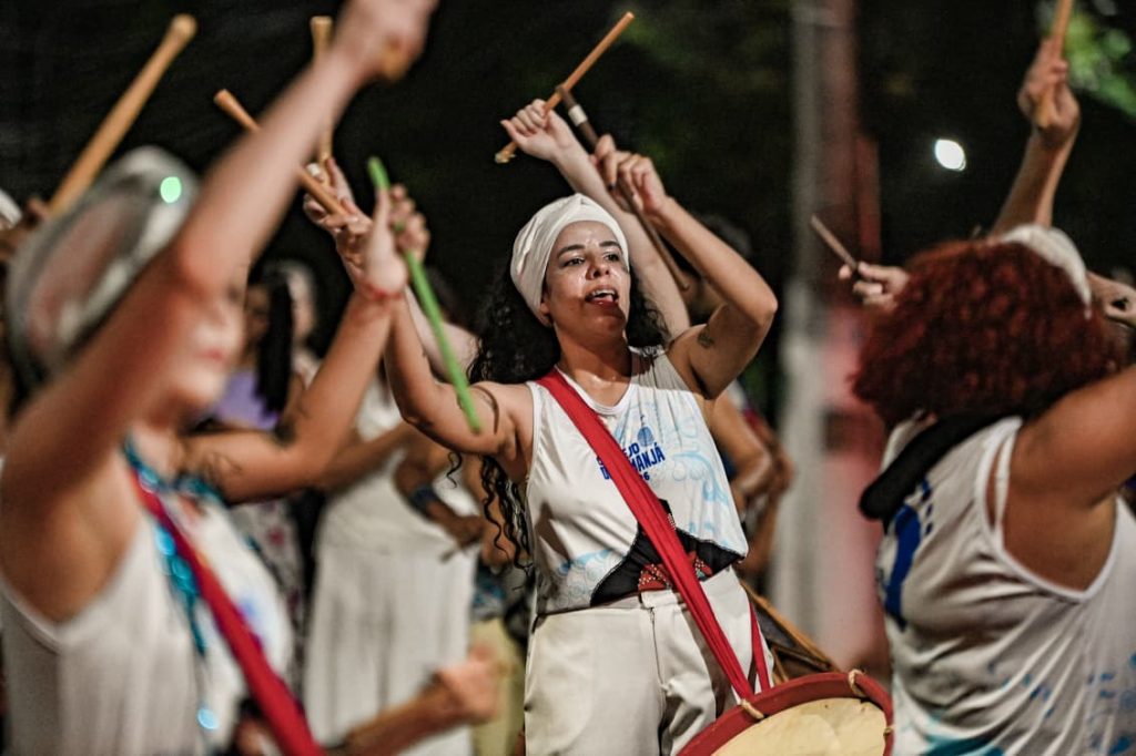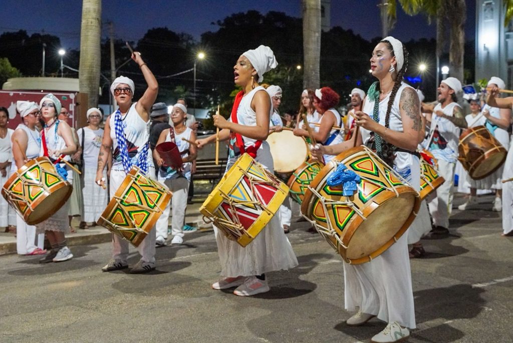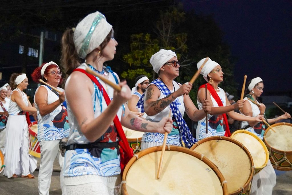 A programação incluiu apresentações de maracatu, samba e batuques tradicionais. O grupo Maracatu Pé Rachado e os Batuqueiros do Coco abriram o cortejo deste ano, conduzindo o ritmo da caminhada e atraindo a atenção de quem acompanhava pelas calçadas.
