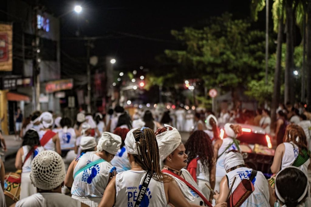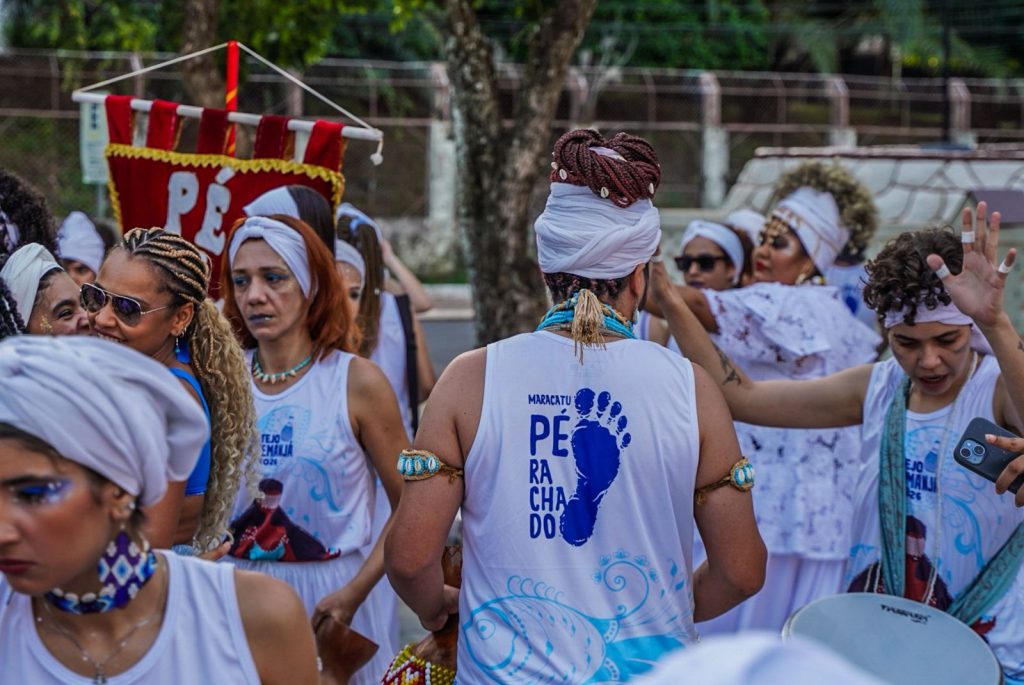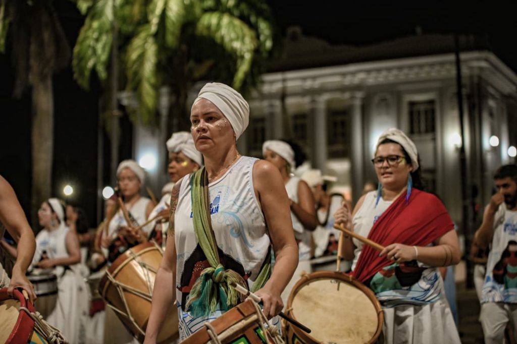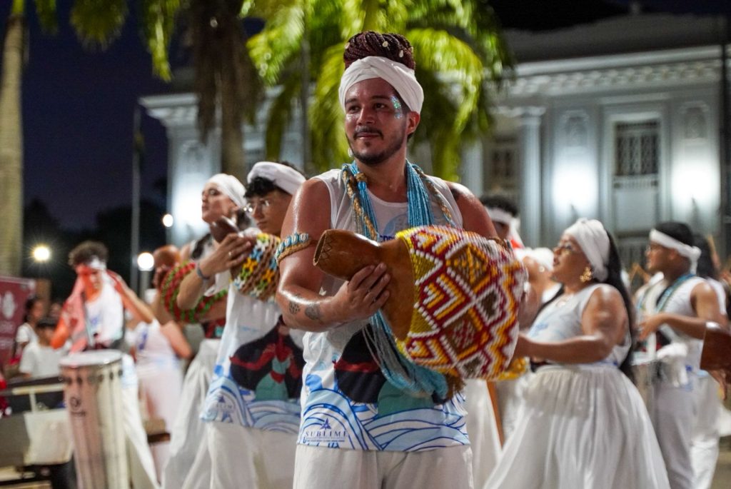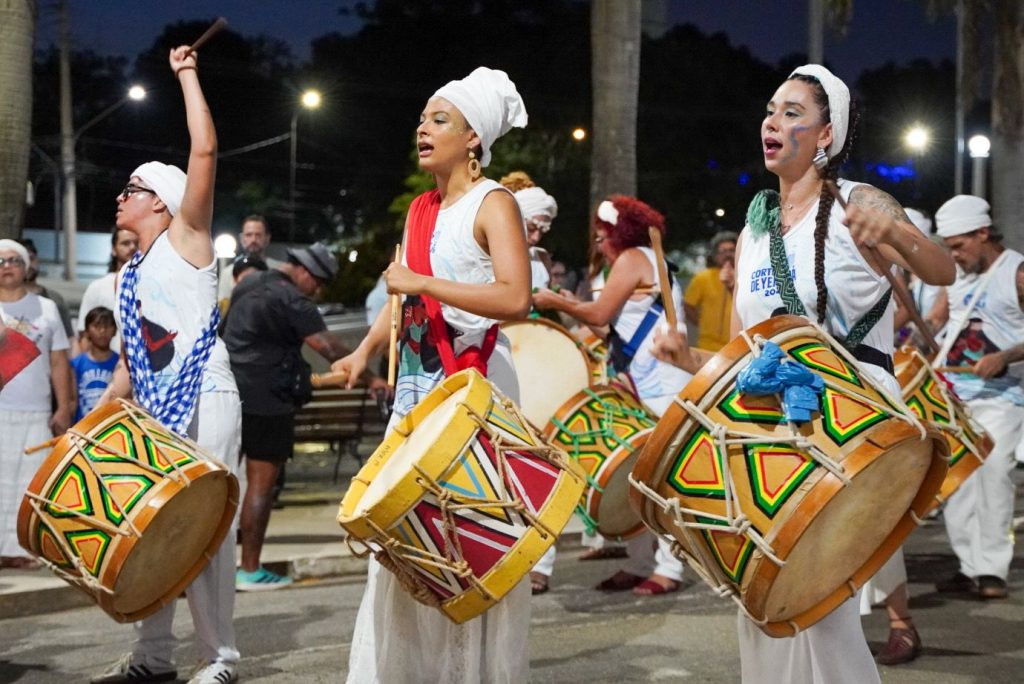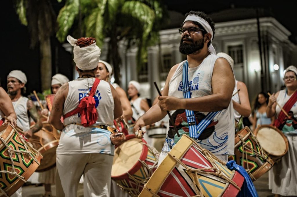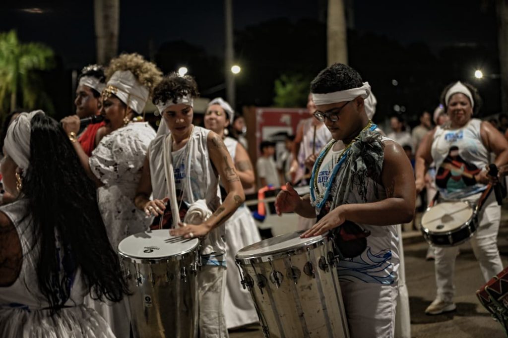 A programação incluiu apresentações de maracatu, samba e batuques tradicionais. O grupo Maracatu Pé Rachado e os Batuqueiros do Coco abriram o cortejo deste ano, conduzindo o ritmo da caminhada e atraindo a atenção de quem acompanhava pelas calçadas.