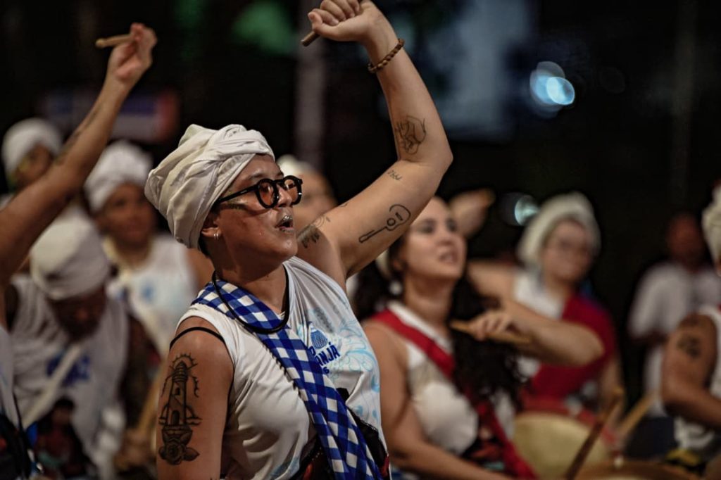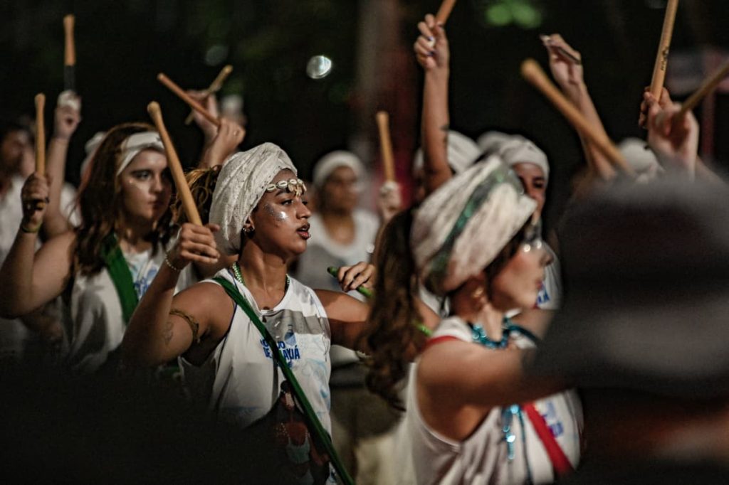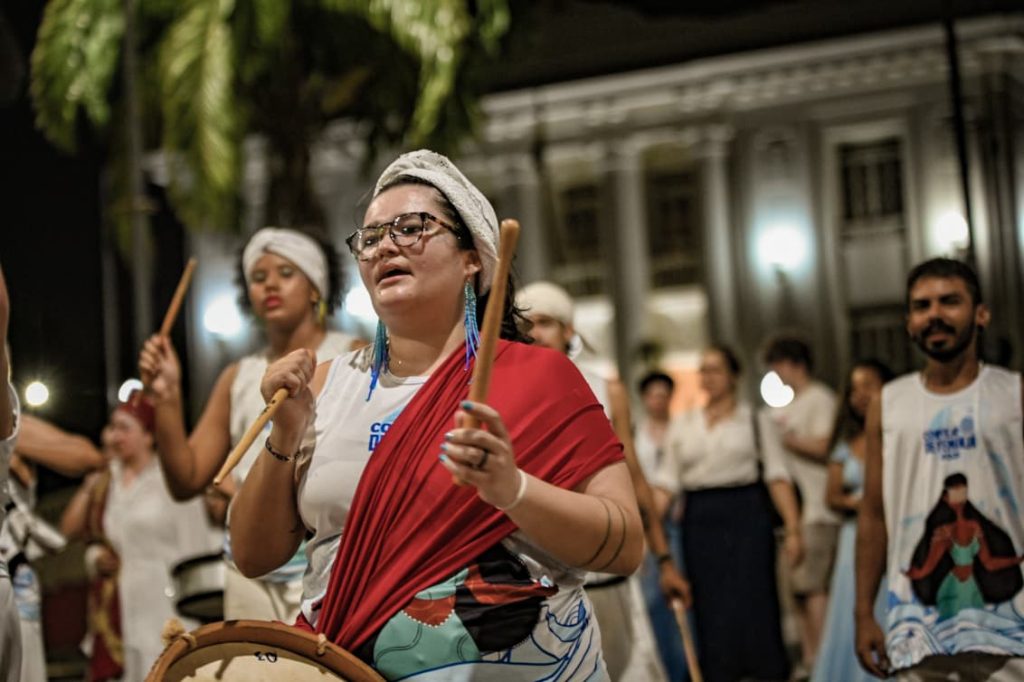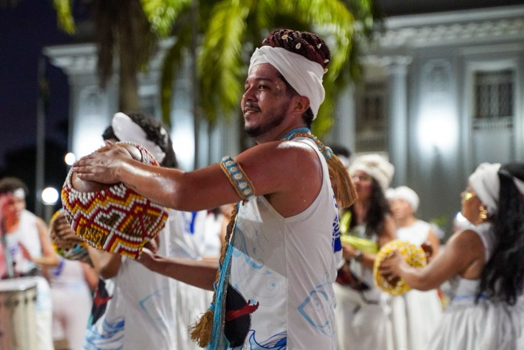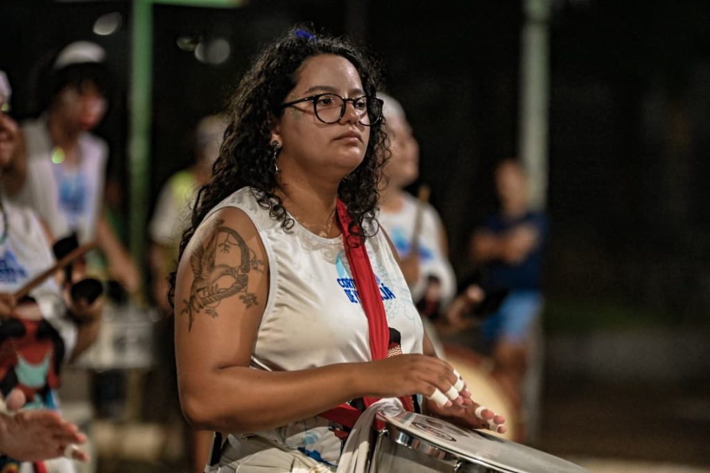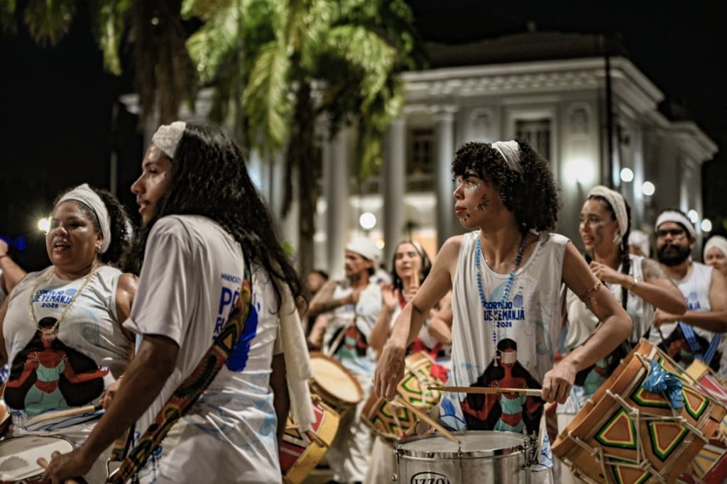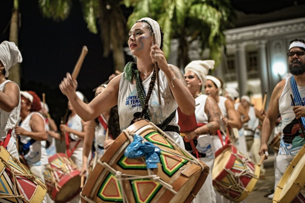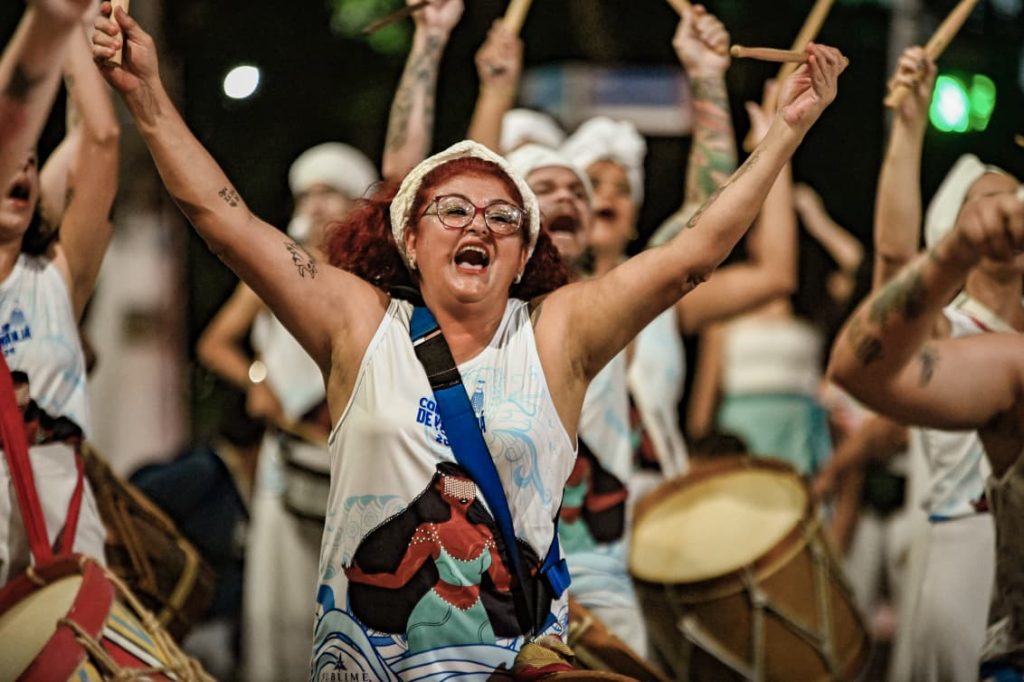 A programação incluiu apresentações de maracatu, samba e batuques tradicionais. O grupo Maracatu Pé Rachado e os Batuqueiros do Coco abriram o cortejo deste ano, conduzindo o ritmo da caminhada e atraindo a atenção de quem acompanhava pelas calçadas.