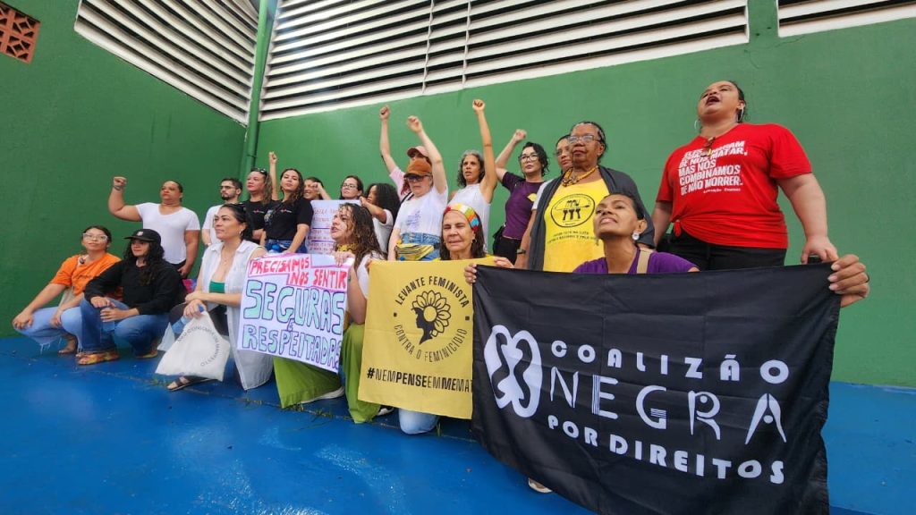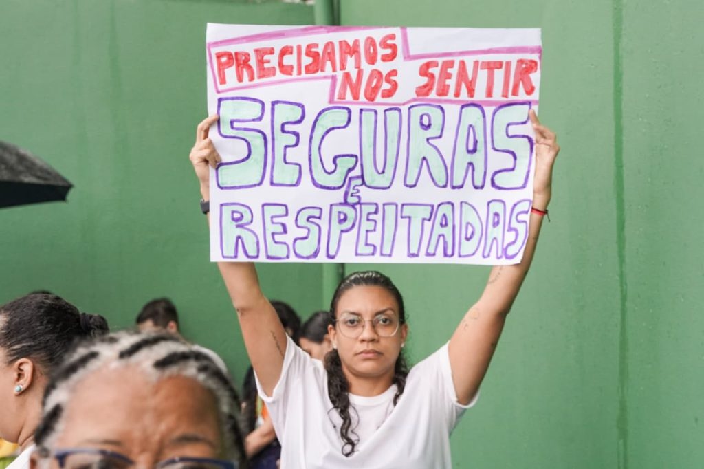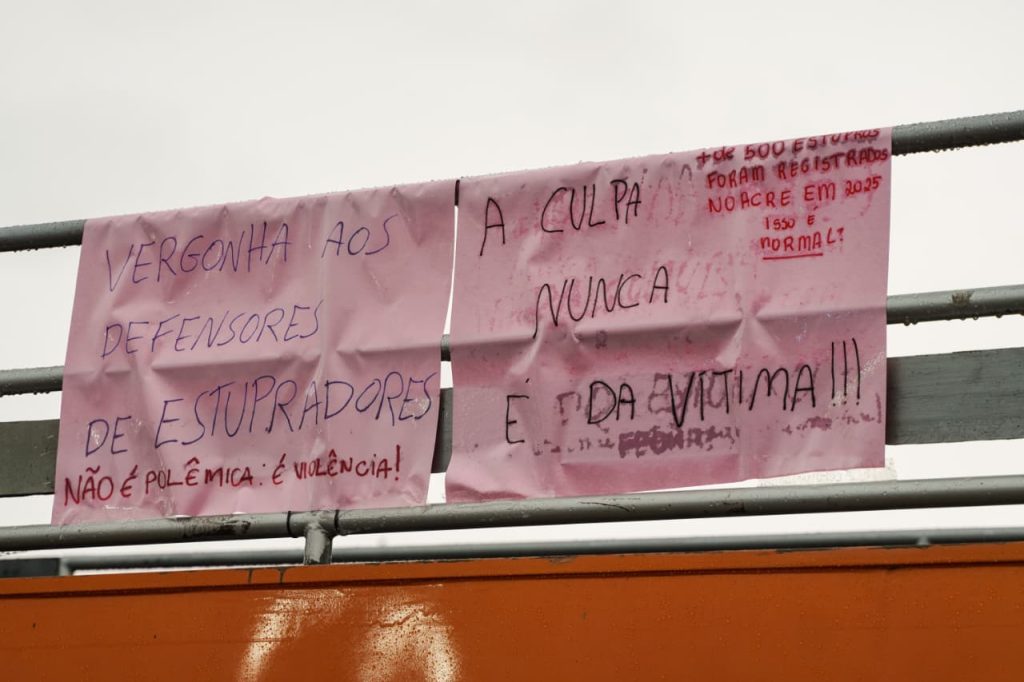 A mobilização começou às 15h e foi marcada por palavras de ordem contra a impunidade. Com cartazes e gritos como “Feminicida não merece torcida!”, as manifestantes pediram responsabilização no caso investigado pela polícia e criticaram a permanência de figuras públicas condenadas por crimes graves em espaços de ampla visibilidade social.